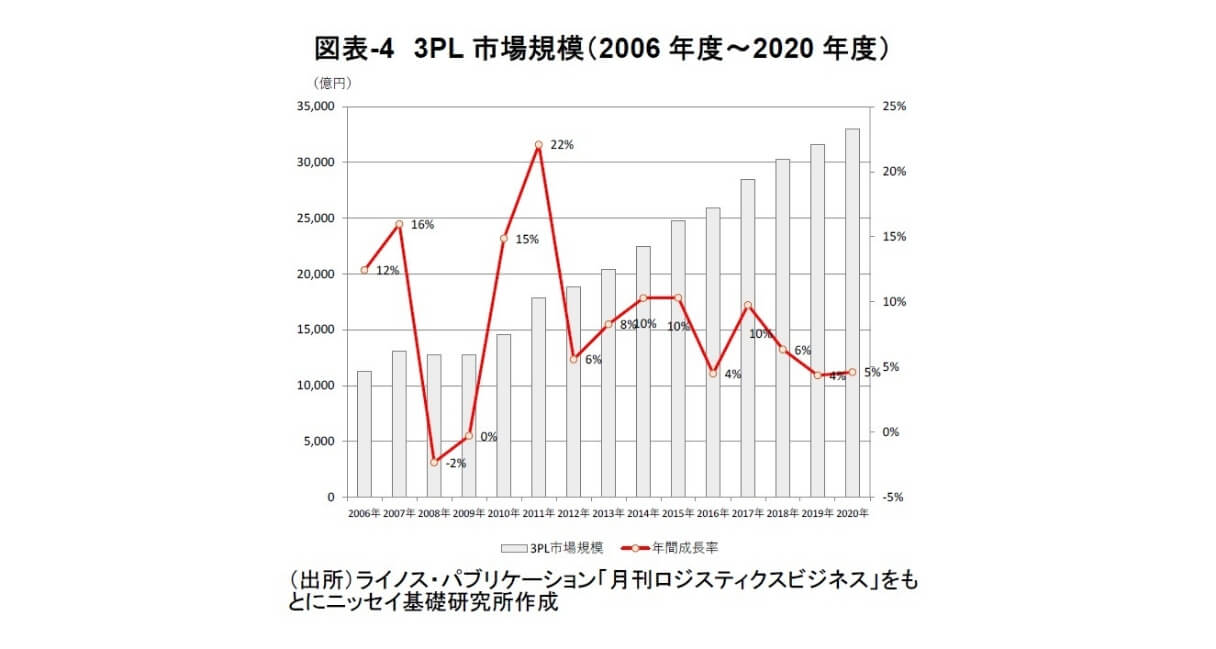 月刊ロジスティクスビジネス(参照URL:https://www.nli-research.co.jp/report/detail/id=69928?pno=2&site=nli)の調査によると、3PLの市場規模は2010年以降成長が続いています。